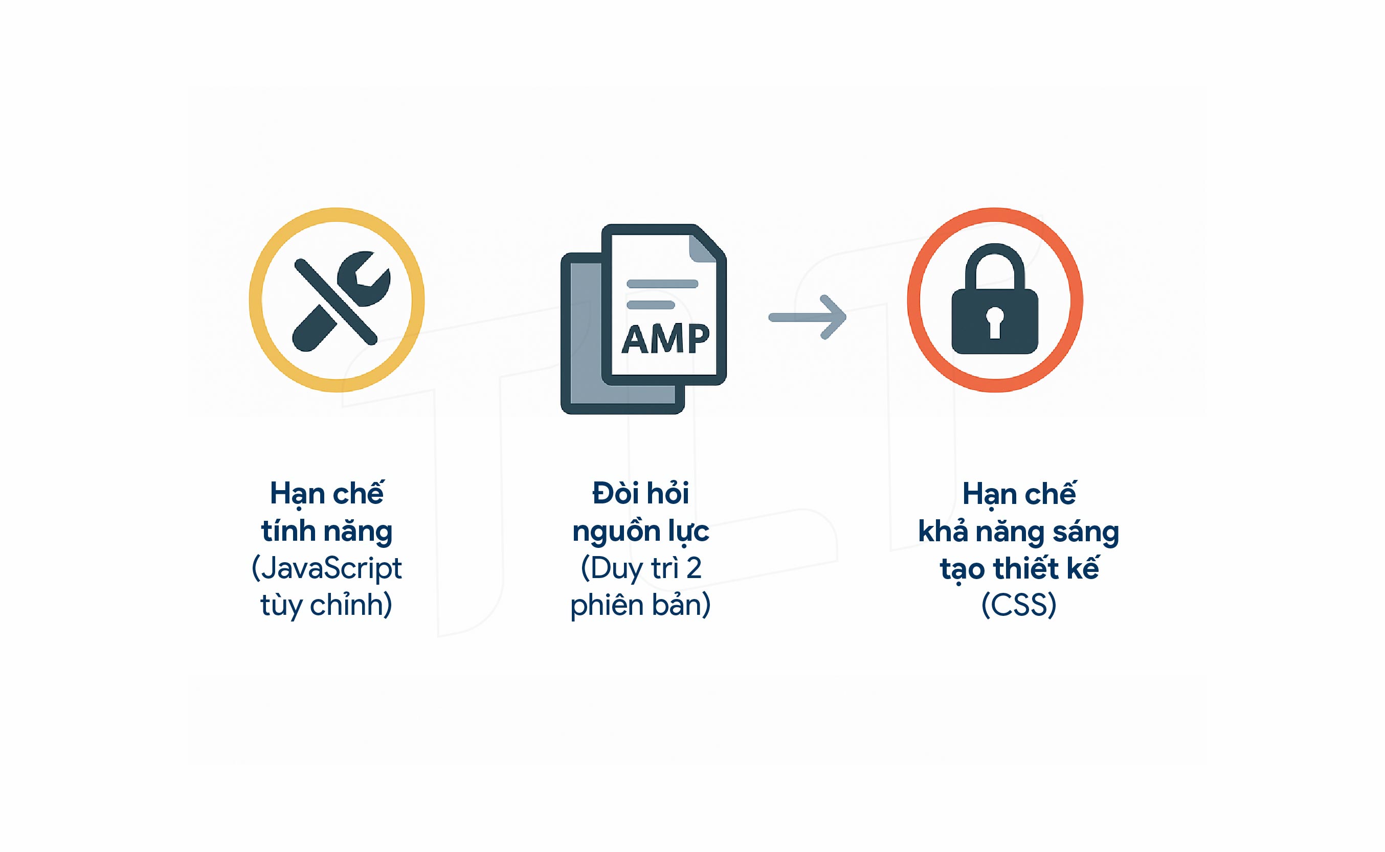 Một trong những hạn chế lớn nhất của AMP là nó giới hạn nghiêm ngặt việc sử dụng JavaScript và CSS tùy chỉnh. Điều này có thể gây khó khăn cho các website có tính năng tương tác phức tạp hoặc yêu cầu thiết kế đồ họa độc đáo.