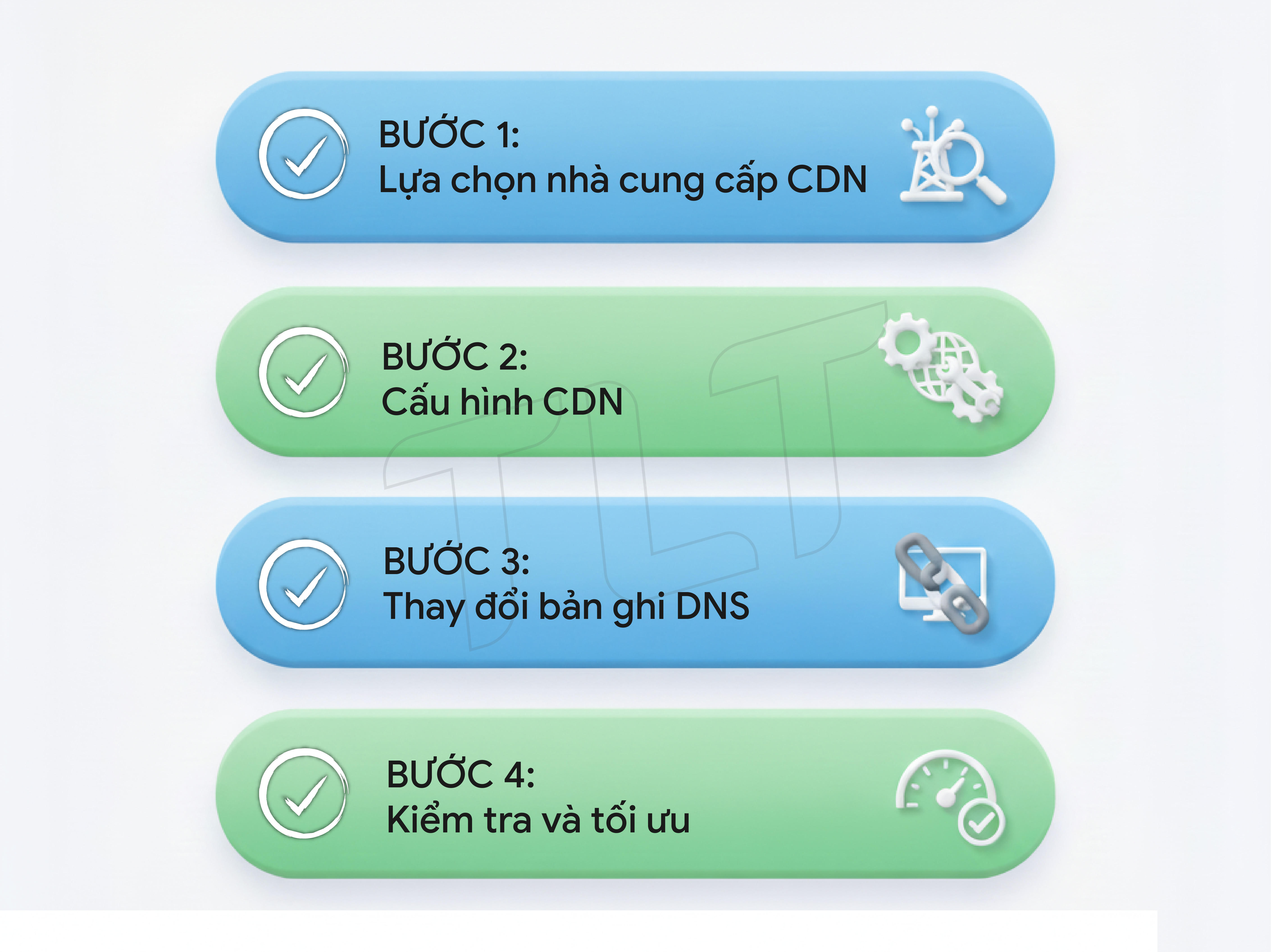 Bước 1: Lựa chọn nhà cung cấp CDN: Dựa trên các tiêu chí đã nêu, chọn nhà cung cấp phù hợp. Đăng ký tài khoản và gói dịch vụ.