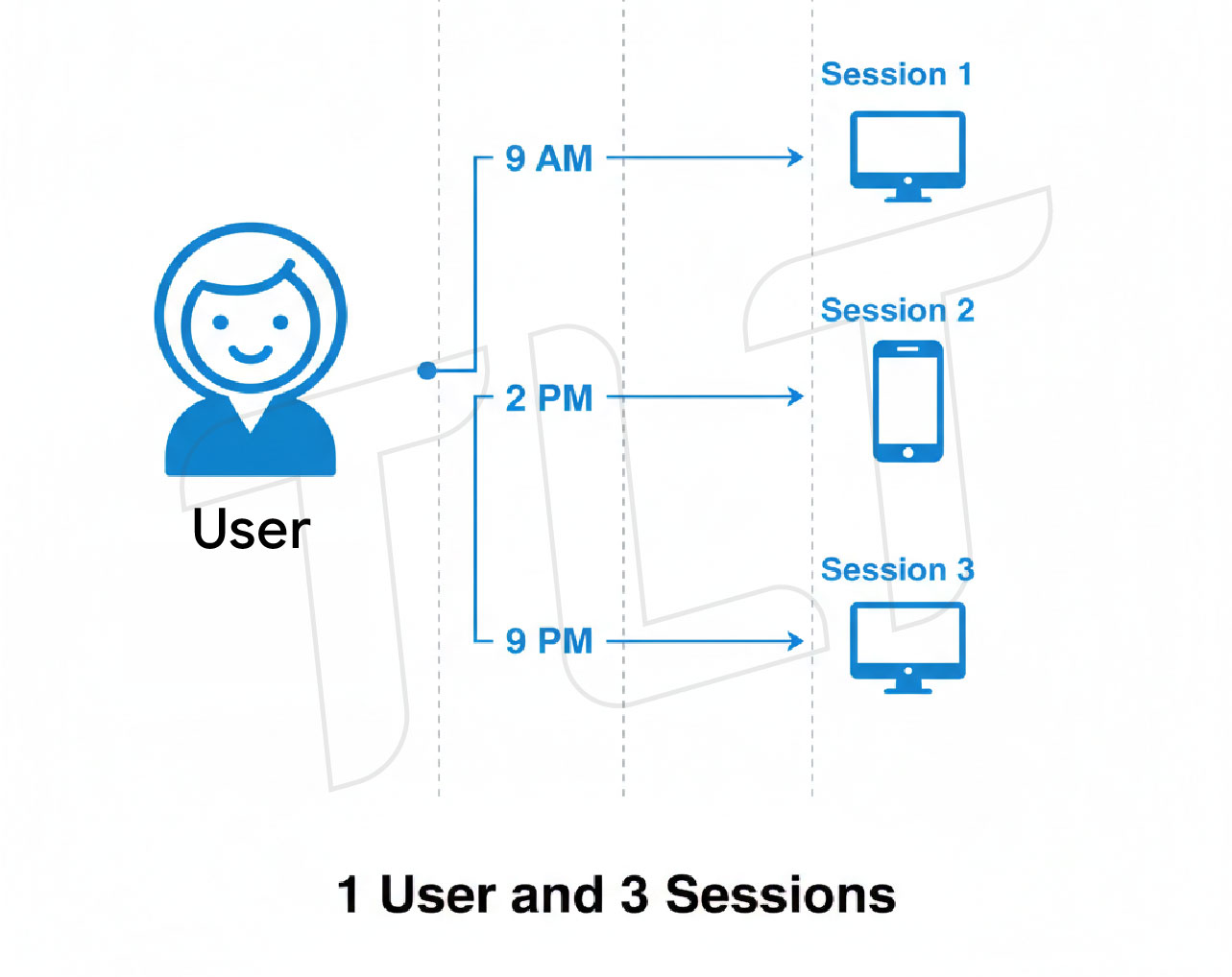 Trong trường hợp này, Google Analytics sẽ ghi nhận 1 User (Anh An) nhưng 3 Sessions (tương tác tại 9h sáng, 2h chiều, 9h tối). Nếu anh An sử dụng cùng một trình duyệt trên máy tính bàn và điện thoại, Google Analytics có thể vẫn ghi nhận 2 User nếu không có tính năng User-ID được triển khai (nguồn: ).