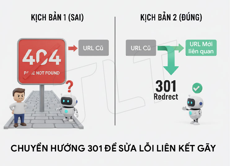 Khi thay đổi URL, luôn thiết lập chuyển hướng 301 từ URL cũ sang URL mới. Đồng thời, kiểm tra các liên kết nội bộ trỏ đến URL cũ và cập nhật chúng để tránh tạo ra liên kết gãy mới trong tương lai.